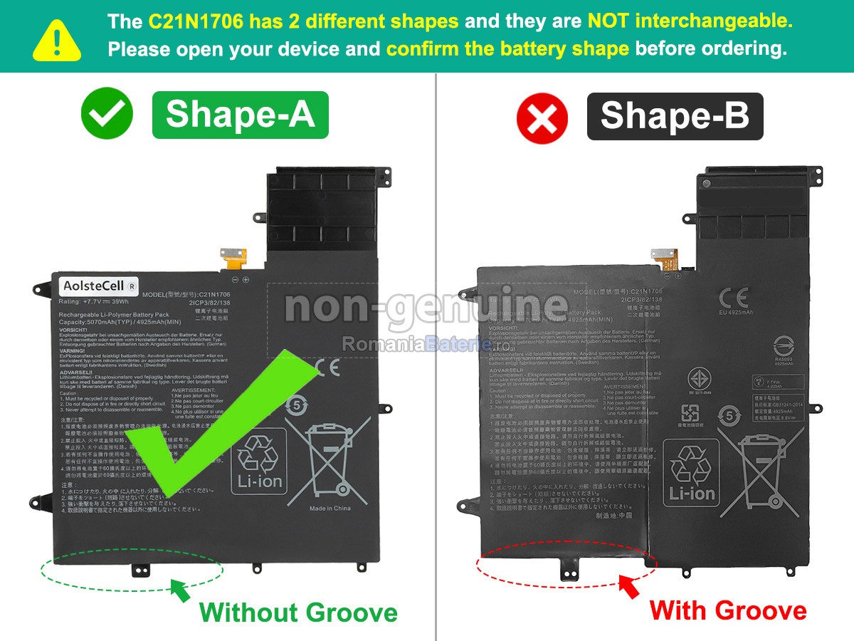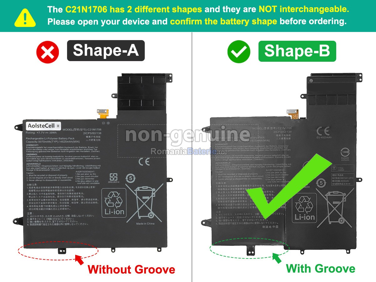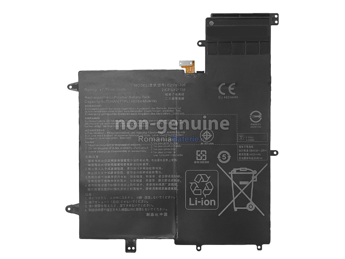 RomaniaBaterie.ro este angajat în asigurarea securității și nu folosește niciodată materiale de calitate inferioară. Fiecare baterie compatibilă Asus C21N1706 a fost supusă la sute de teste riguroase înainte de a părăsi fabrica, pentru a se asigura că îndeplinește cele mai înalte standarde de calitate. Produsele noastre dețin certificări internaționale precum CE, UL, ROHS, ICPE și altele, ceea ce le face conforme cu cele mai stricte norme de calitate și siguranță. Acest lucru vă oferă o experiență de utilizare fără griji, fără a vă face să vă îngrijorați de potențialele riscuri.