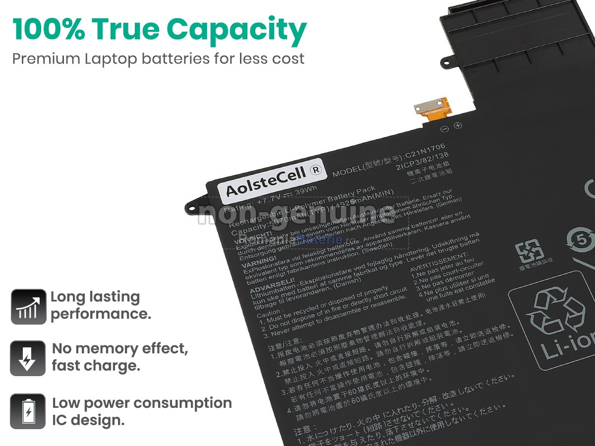 Baterie laptop Asus C21N1706 cu durată lungă de utilizare cu celule de înaltă calitate, care vă oferă o durată de utilizare îndelungată a bateriei, vă asigură că laptopul dumneavoastră poate funcționa în continuare eficient după o utilizare pe termen lung și nu trebuie încărcat frecvent, reducând astfel frecvența de încărcare, permițând să vă concentrați mai mult pe muncă și divertisment.