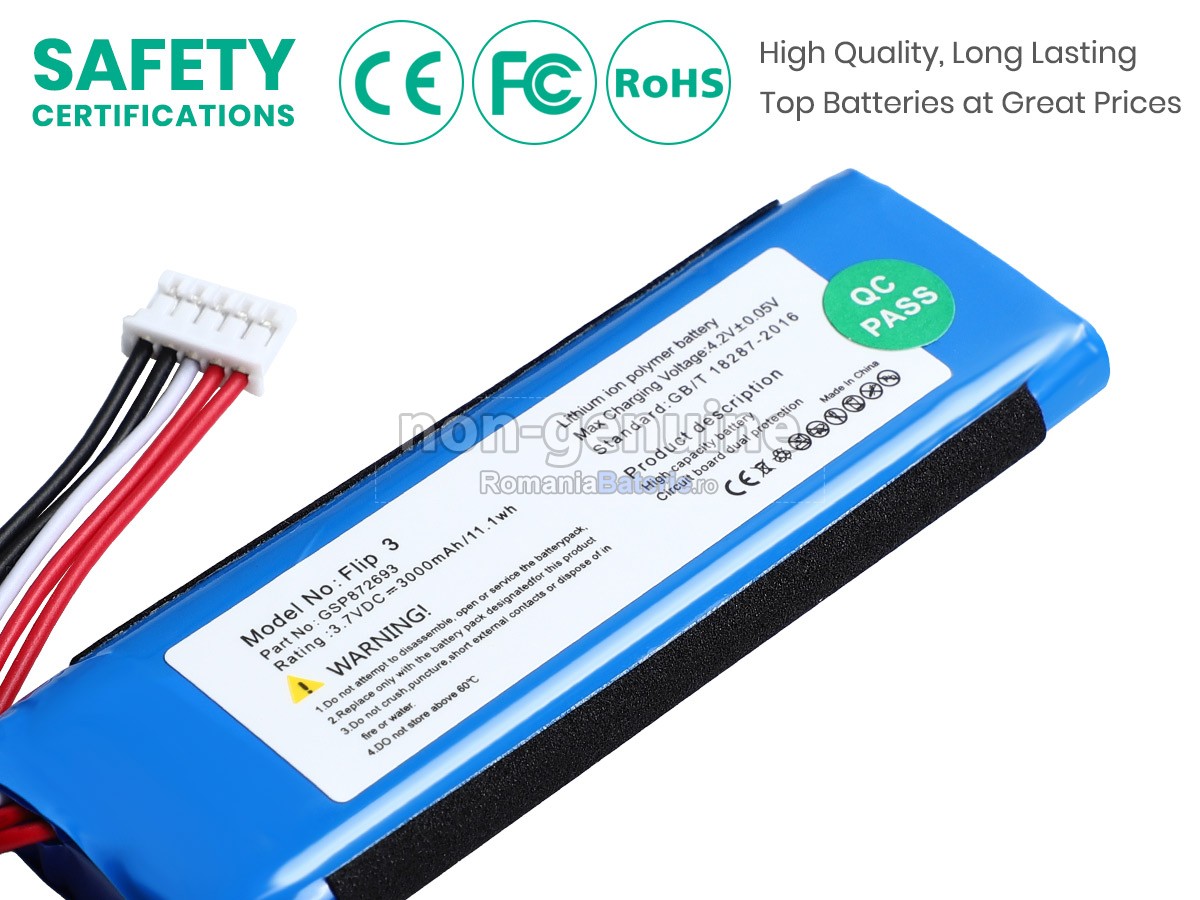 RomaniaBaterie.ro este angajat în asigurarea securității și nu folosește niciodată materiale de calitate inferioară. Fiecare baterie compatibilă JBL GSP872693 a fost supusă la sute de teste riguroase înainte de a părăsi fabrica, pentru a se asigura că îndeplinește cele mai înalte standarde de calitate. Produsele noastre dețin certificări internaționale precum CE, UL, ROHS, ICPE și altele, ceea ce le face conforme cu cele mai stricte norme de calitate și siguranță. Acest lucru vă oferă o experiență de utilizare fără griji, fără a vă face să vă îngrijorați de potențialele riscuri.