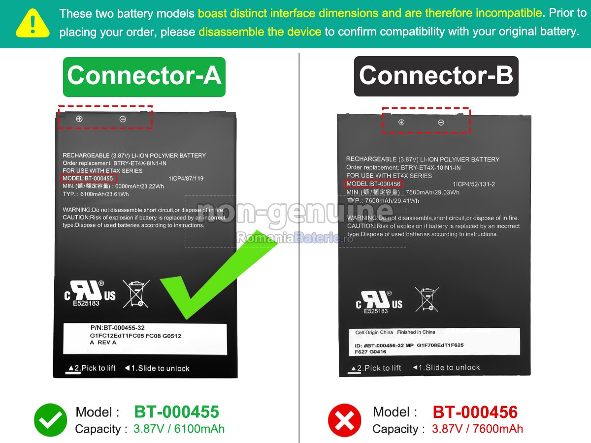 RomaniaBaterie.ro este angajat în asigurarea securității și nu folosește niciodată materiale de calitate inferioară. Fiecare baterie compatibilă Zebra ET45HC a fost supusă la sute de teste riguroase înainte de a părăsi fabrica, pentru a se asigura că îndeplinește cele mai înalte standarde de calitate. Produsele noastre dețin certificări internaționale precum CE, UL, ROHS, ICPE și altele, ceea ce le face conforme cu cele mai stricte norme de calitate și siguranță. Acest lucru vă oferă o experiență de utilizare fără griji, fără a vă face să vă îngrijorați de potențialele riscuri.